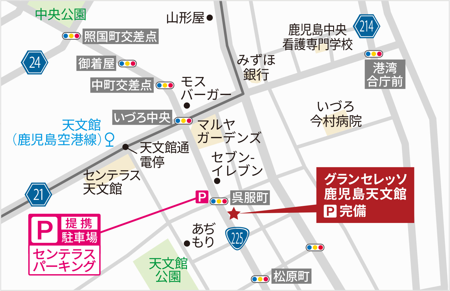 天文館の中心に位置し、電車でのアクセスも良好です。