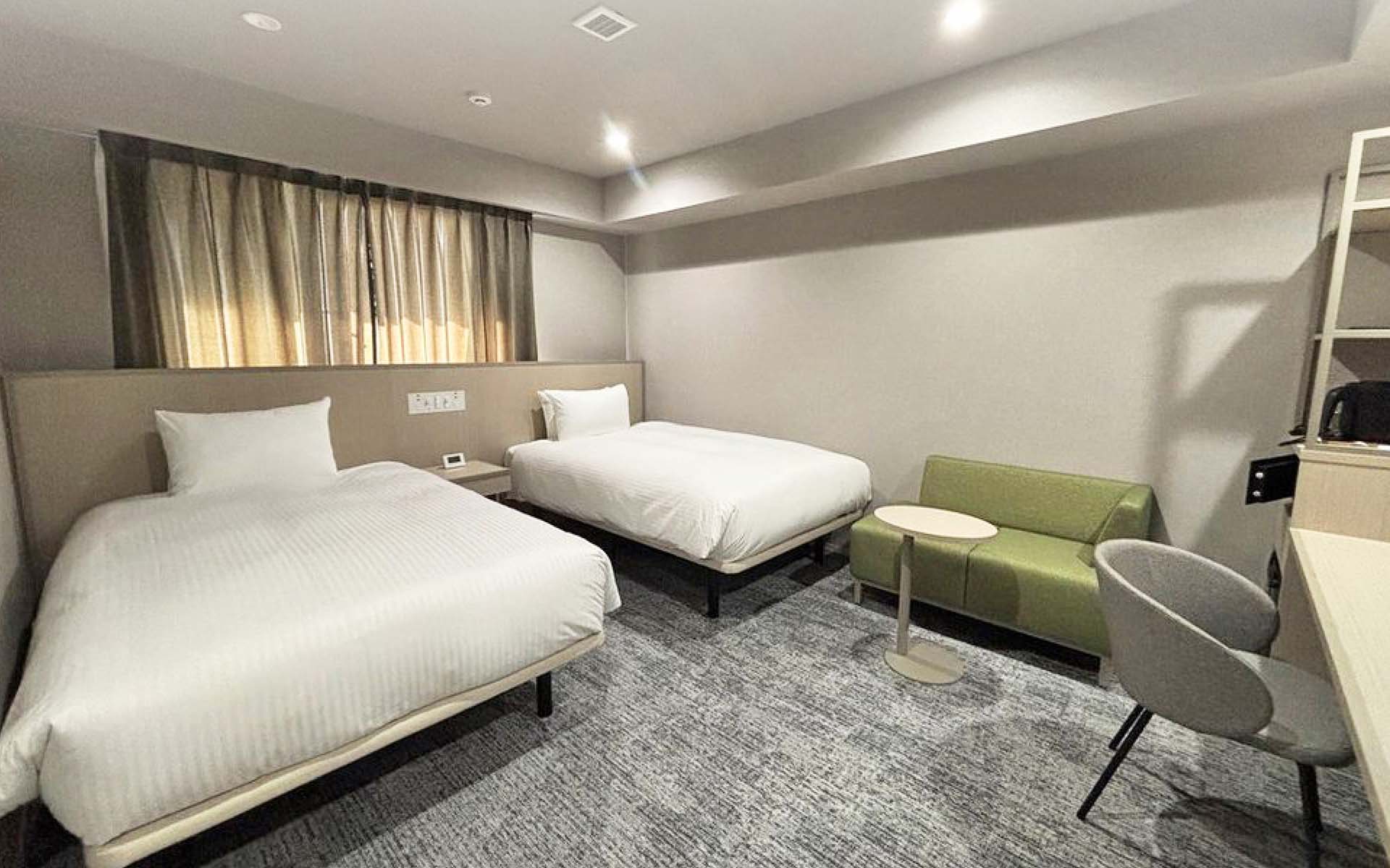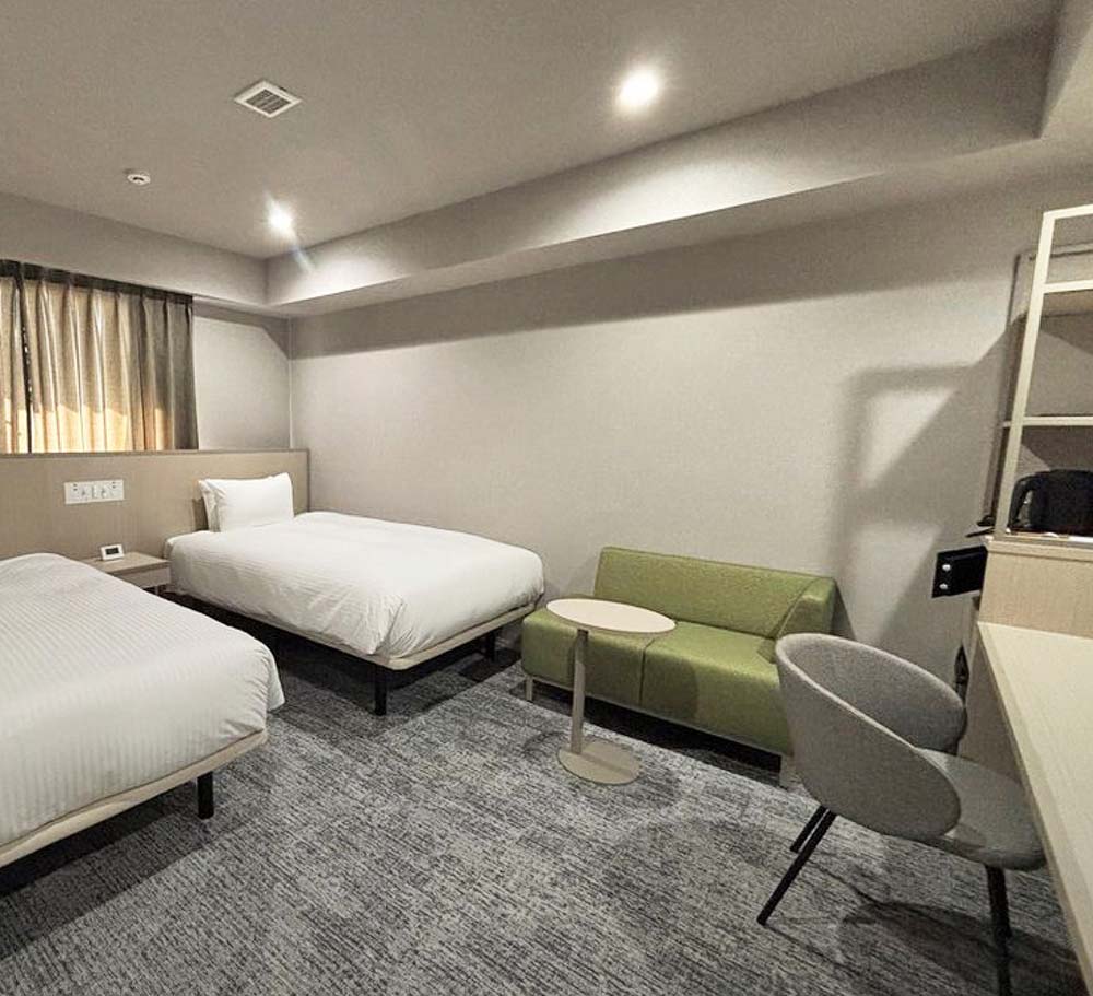 1,000mm幅のシモンズ社製ベッドを2台設置。広さ19.9㎡のコンパクトながら快適な客室です。43型液晶テレビ(動画アプリ・ミラーリング対応)など便利な設備を完備。独立したバスルームとトイレを備え、機能的で快適な滞在をサポートします。
